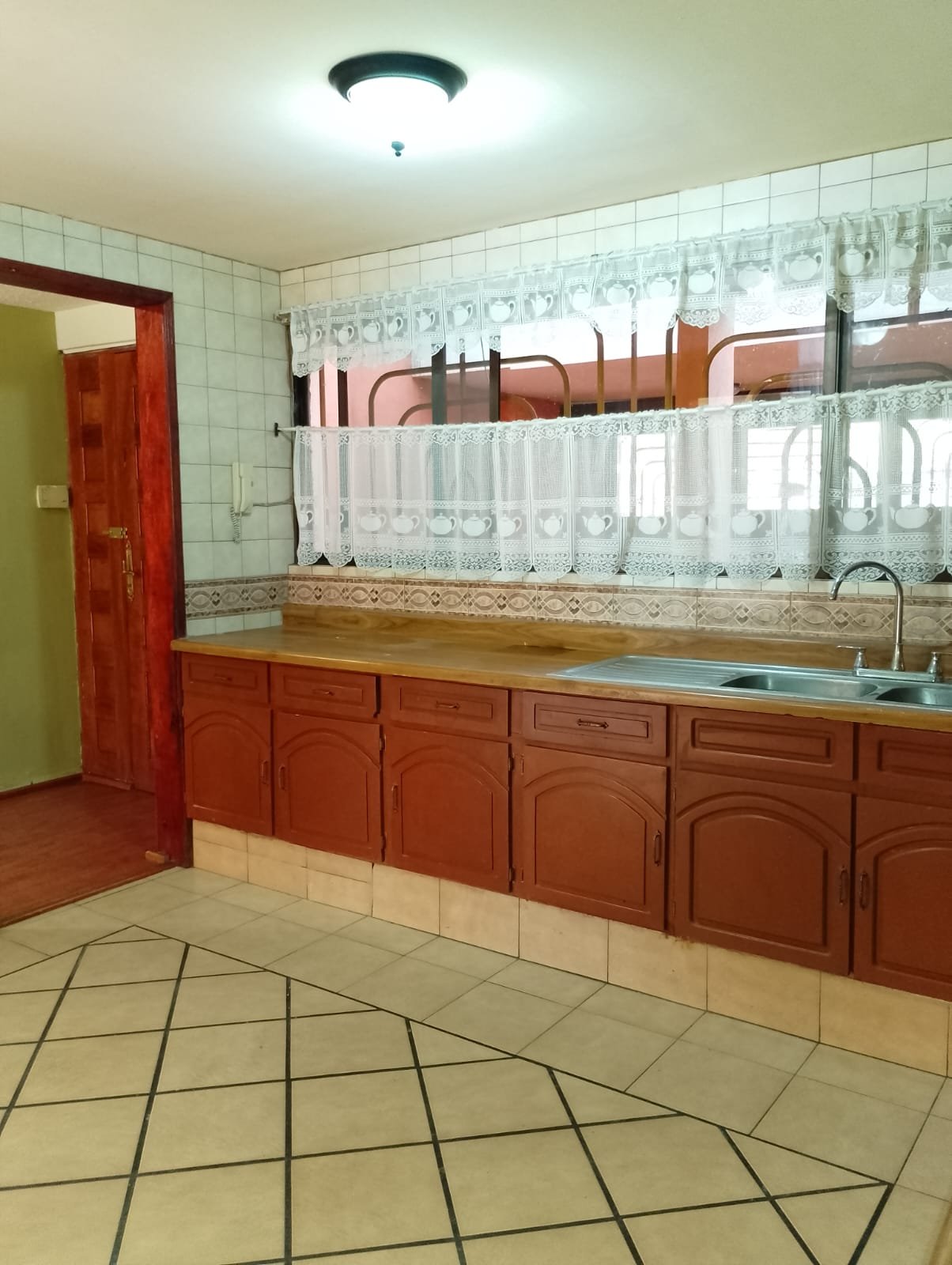 Cocina equipada con gabinetes y estufa.