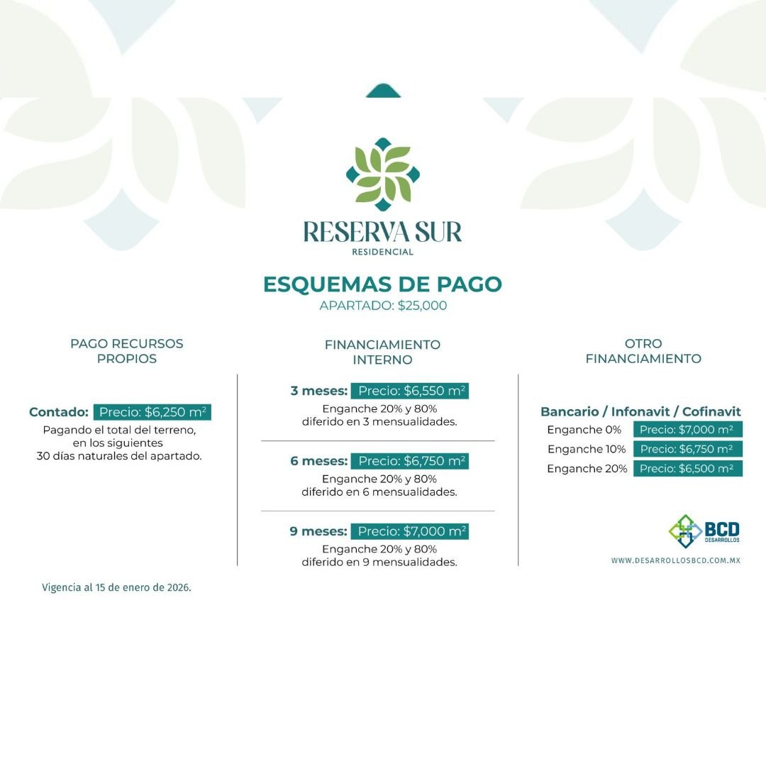 - 20% Enganche: $6,500 por m²